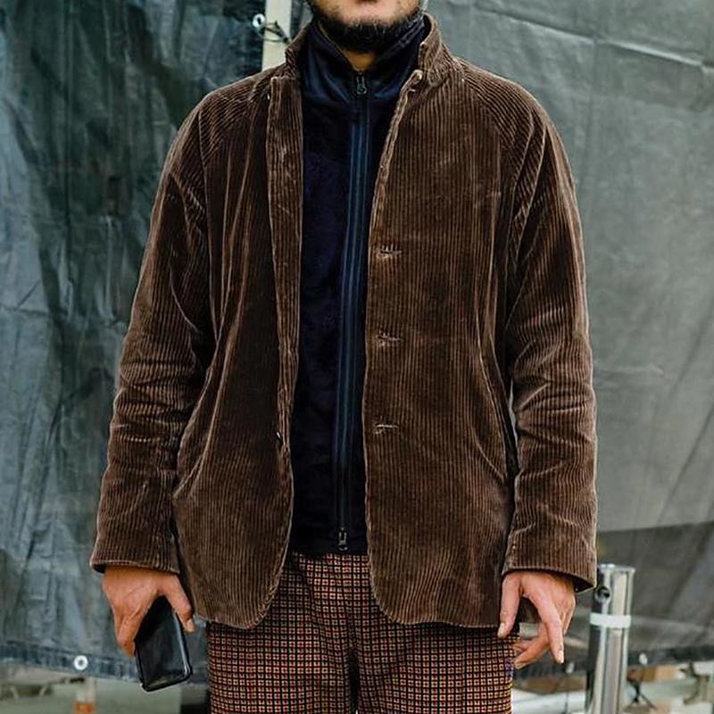 Men's Corduroy Jacket Outdoor Vacation Warm Buttons Fall Winter Plain Fashion Streetwear Stand Collar Regular Black Coffee Jacket