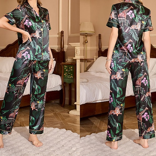 Per donna Abbigliamento da Casa Set Pigiama Moda Casual Grafico Elastico in vita Bottoni Pantalone Casa Vacanza Manica Corta Bavero Blu Nero Verde militare Verde Cachi Estate Primavera Autunno