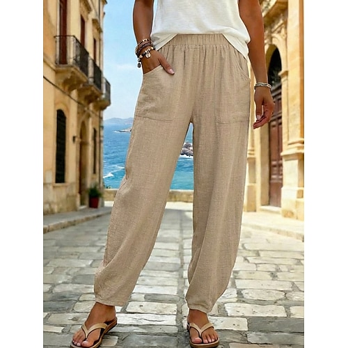 Per donna 100% cotone Pantaloni Estivi Pantaloni Pantaloni da Spiaggia Vacanza Boho Lunghezza alla caviglia Naturale Tinta unica Tasca Elastico in vita Spiaggia Casual Nero Bianco Verde militare Blu