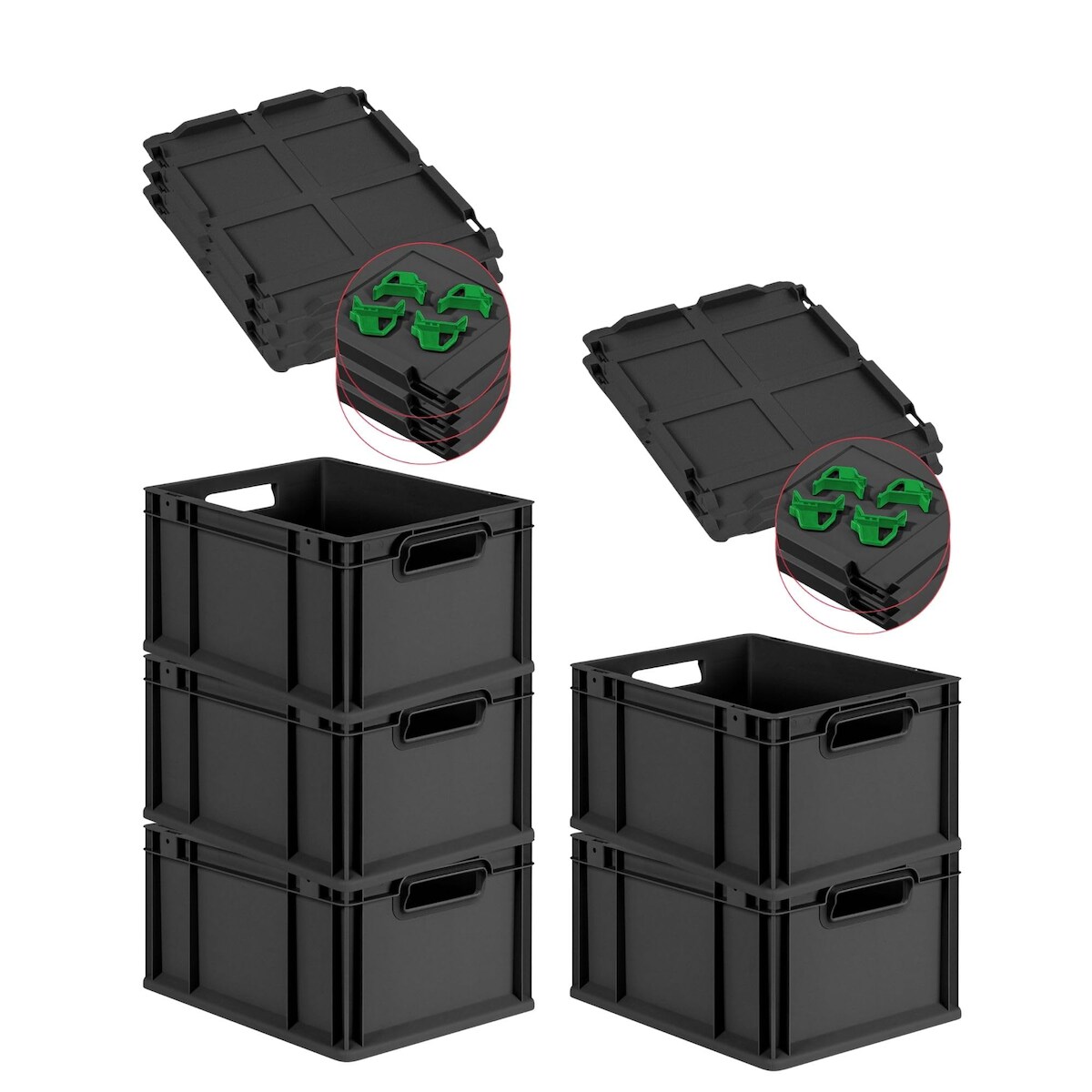 PROREGAL SuperSparSet 5x Eurobox NextGen Grip mit Scharnierdeckel & grünen Verschlüssen, HxBxT 22x30x40cm, 20L, Schwarz, Griffe offen, Eurobehälter