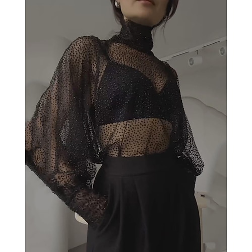 Per donna Blusa A Pois Casual Manica Lunga Collo Alto Top Regolari Quotidiano Ferie Uscire Rete Nero Estate Autunno