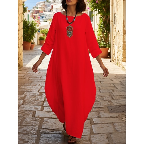 Per donna Abito maxi Finto cotone e lino Abito Boho Vestito a caftano Vestito Casual Elegante Moda Moderno All'aperto Vacanza Uscire Vestibilità comoda Semplice Manica Lunga Girocollo Blu Nero Bianco