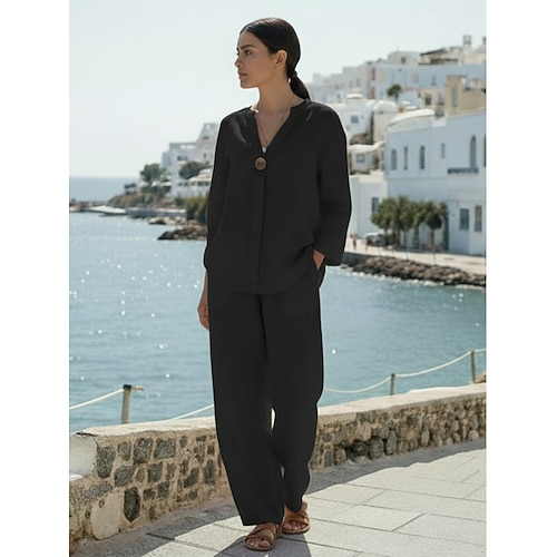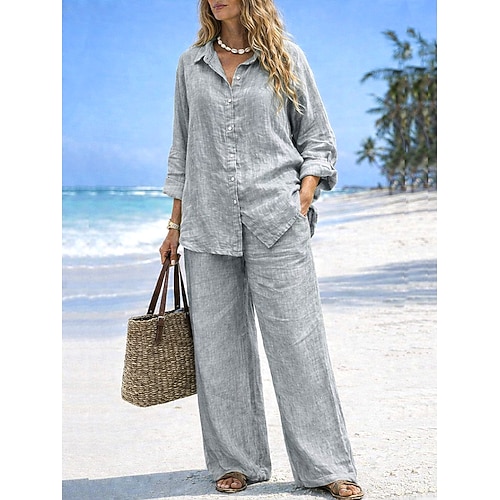 Per donna Set di Pantaloni Bolero Finto cotone e lino Manica Lunga Colletto a Camicia Tinta unica Moda Streetwear Casuale Quotidiano All'aperto Blu Nero Bianco Estate Vestibilità comoda