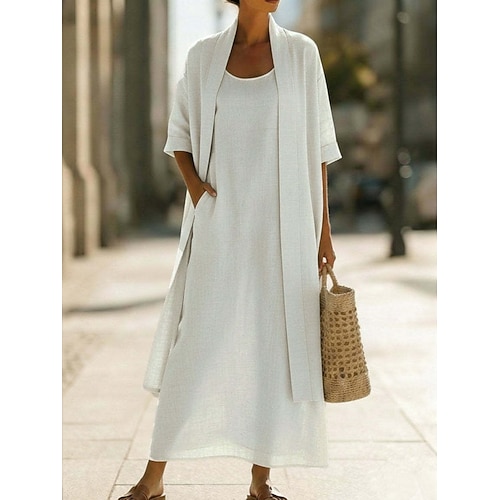 Per donna Abito Midi 100% cotone Abito a Tubino Abiti in cotone e lino Vestito Casual Elegante Vintage Essenziale Quotidiano Vacanza Vestibilità comoda Semplice Manica Corta Girocollo Bianco Viola