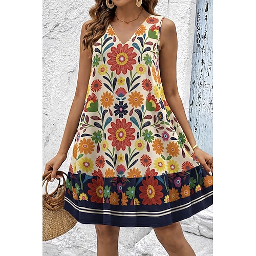 Per donna Mini Abito Vestito Estivo Abito a trapezio Abito Estivo Casual Quotidiano Ferie Vestibilità comoda Floreale Grafico Tribale Senza Maniche Scollo a V Nero Beige Estate Primavera