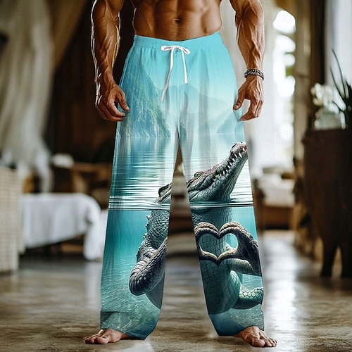 Herren Herz Tiermotiv Krokodil Hose Baggy-Hosen Freizeithose Mittlere Taille Lustig Outdoor Urlaub Elastischer Kordelzug in der Taille Leinenähnliche Hose mit Taschen Frühling Herbst 3D-Druck Grün