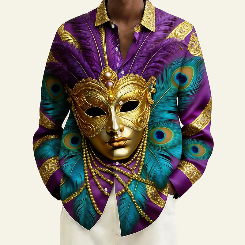 Mardi Gras Men's Carnival Beads Mask with Feathers Shirt Button Up Shirt Long Sleeve Vintage Retro Holiday Summer Spring Turndown 3D Print Linen Like Shirt Purple Green