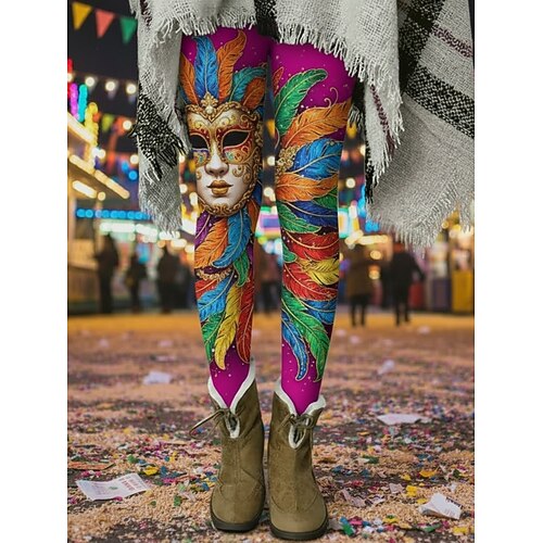 Karnevals-Leggings für Damen, bequeme Leggings im Vintage- und Ethno-Stil, lange Hose mit hohem Bund, Grafikprint, bequem, dehnbar, lässig, für den Alltag, gelb, lila, fuchsia, orange