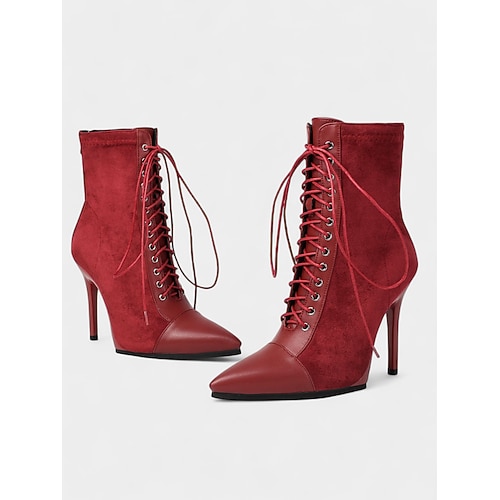 stivaletti rossi da donna con lacci e punta a punta, eleganti e raffinati, perfetti per feste di Natale, abiti da sera e occasioni formali