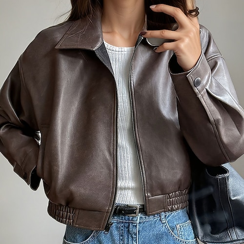 Per donna Giacca in Ecopelle Cappotto Invernale Caldo Confortevole Patchwork Cerniera Tasca Casual Tinta unica Vacanza Streetwear Casuale Abbigliamento quotidiano Regolare Collo ripiegato Vestibilit