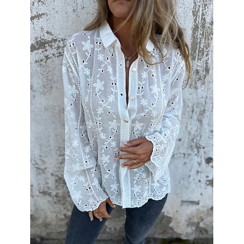 Per donna Blusa Tinta unica Elegante Casual Manica Lunga Colletto a Camicia Top Regolari Quotidiano Traforato Bianco Albicocca Estate Primavera