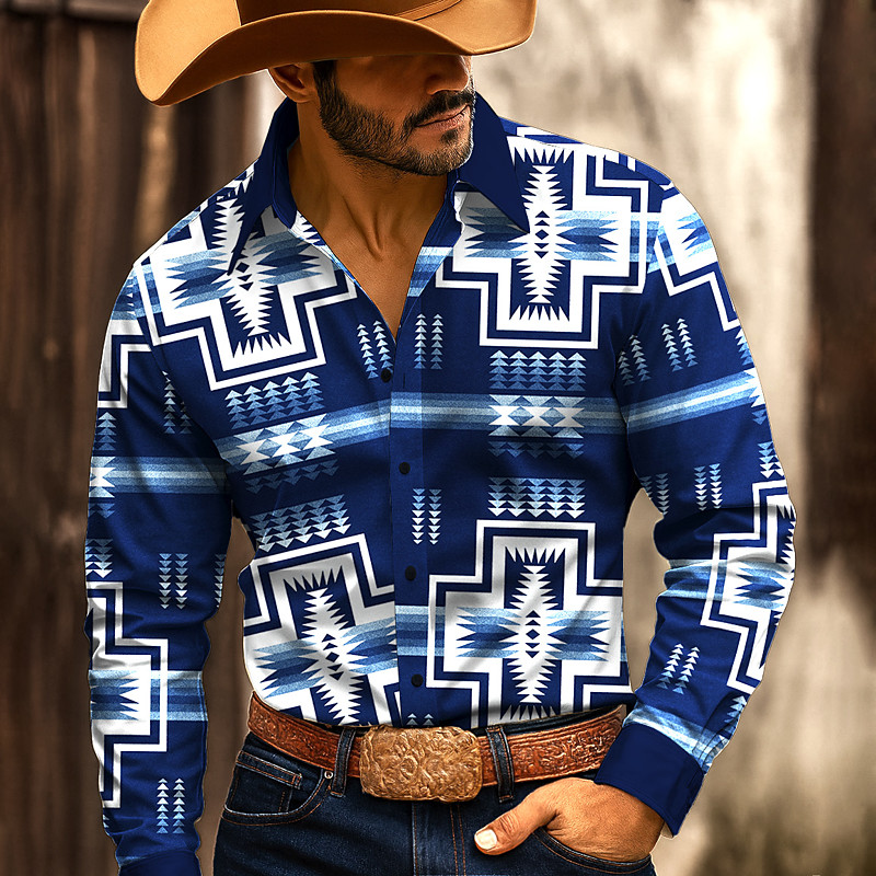 Men's Aztec Geometric Pattern Ethnic Shirt Western Shirt Button Up Shirt Long Sleeve Vintage Retro Outdoor Casual WorkWear Spring Fall Turndown 3D Print Collared Shirts Black Burgundy Blue Green