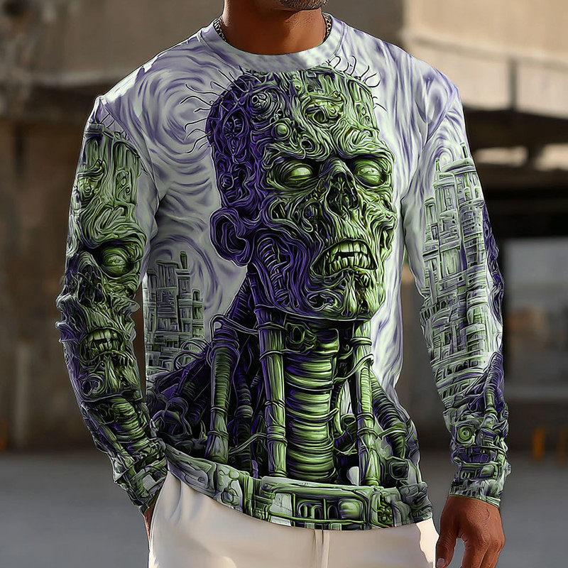 Halloween Men's Optical Illusion Zombies 3D T Shirt Long Sleeve T shirt 3D Print Crew Neck Shirt Fashion Exaggerated Street Casual Daily Blue Purple Green Summer Spring Fall Clothing Apparel S M L XL