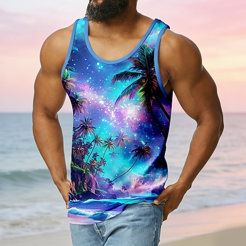Canotta da uomo, canottiera intima, maglietta senza maniche, scollo a U, estiva, galassia, nebulosa, stampa all over, palme tropicali, spiaggia, tramonto, luna, grafica, moda, classica, comoda,