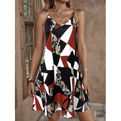 Per donna Mini Abito Abito a trapezio Abito Sottoveste Abito a spalle scoperte Vacanza Casual Spiaggia Uscire Vestibilità comoda Grafico Geometrico Senza Maniche Scollo a V Rosso Estate Primavera