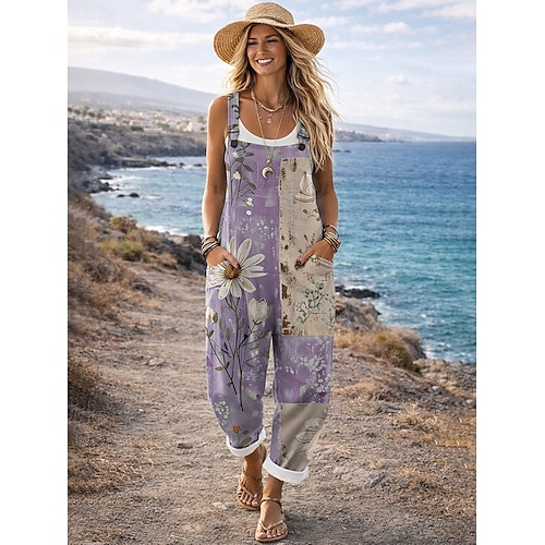 Per donna Tuta Attivo Floreale Senza Maniche Senza maniche Dritto Collo quadrato Patchwork Tasca Quotidiano Spiaggia Vestibilità comoda Blu Viola Verde Estate