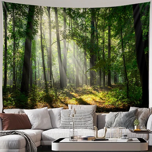 natura foresta luce solare raggi di sole alberi verdi bosco nebbioso arazzo da parete per soggiorno camera da letto dormitorio decorazione paesaggio realistico murale da appendere alla parete