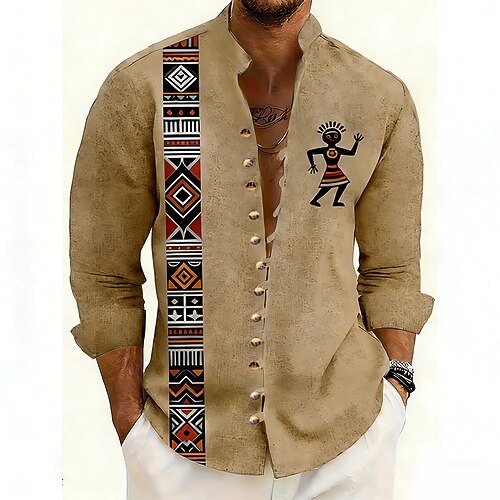 Herren Geometrisch Ethik / Afrikanisch Indigene Völker Hemd Stehkragenhemd Langarm Vintage-Retro Lässig Urlaub Frühling Herbst Mandarinkragen Stehkragen Button-Down Leinenähnliches Hemd Blau Gelb