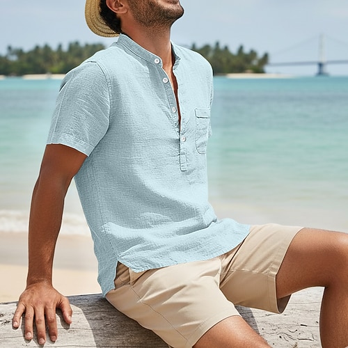 Herren Leinenhemd Sommerhemd Strandbekleidung Freizeithemd Stehkragenhemd Einfarbig Lässig Täglich Schwarz Weiß Hellgrün Blau Kurzarm Henley Sommer Frühling Bekleidung Button-Down