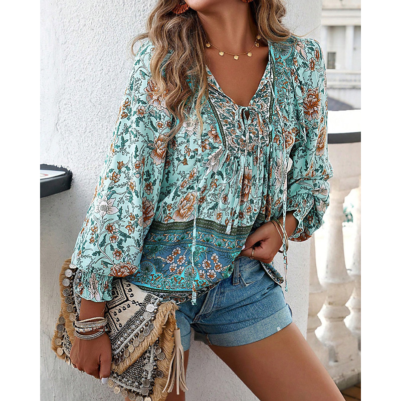 Women's Boho Shirt Blouse Flower Modern Boho Long Sleeve V Neck Regular Tops Daily Going out Print Yellow Pink Navy Blue Blue Orange Summer