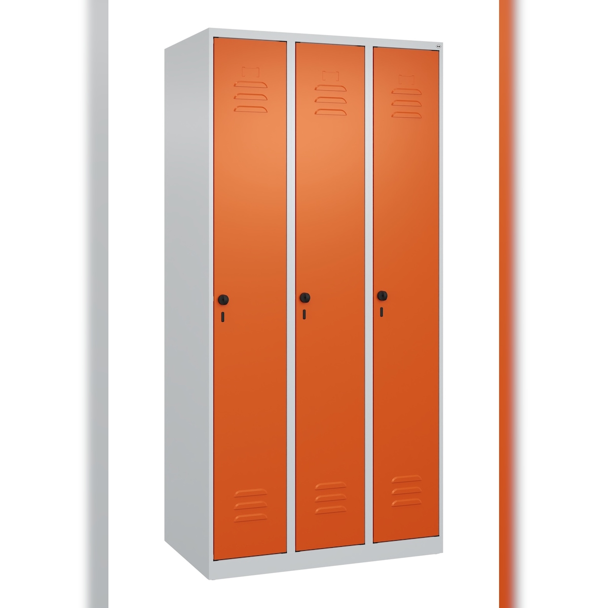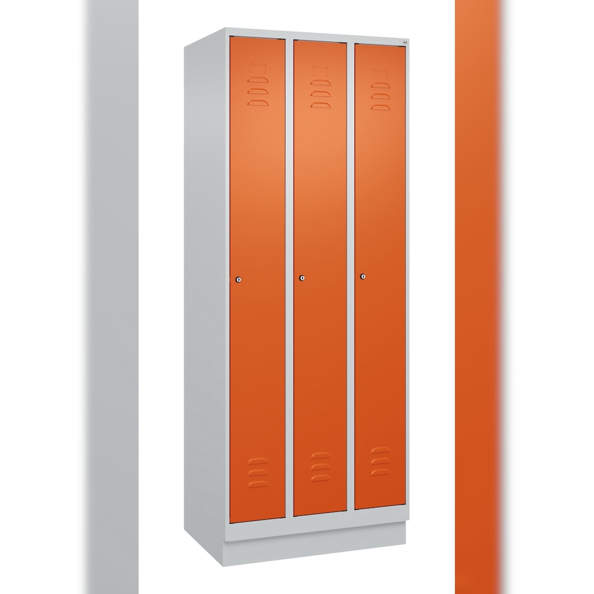 C+P Spind Classic PLUS, Sockel, 3 Abteile, HxBxT 195x75x50cm, Zylinderschloss, Hellgrau/Reinorange von PROREGAL