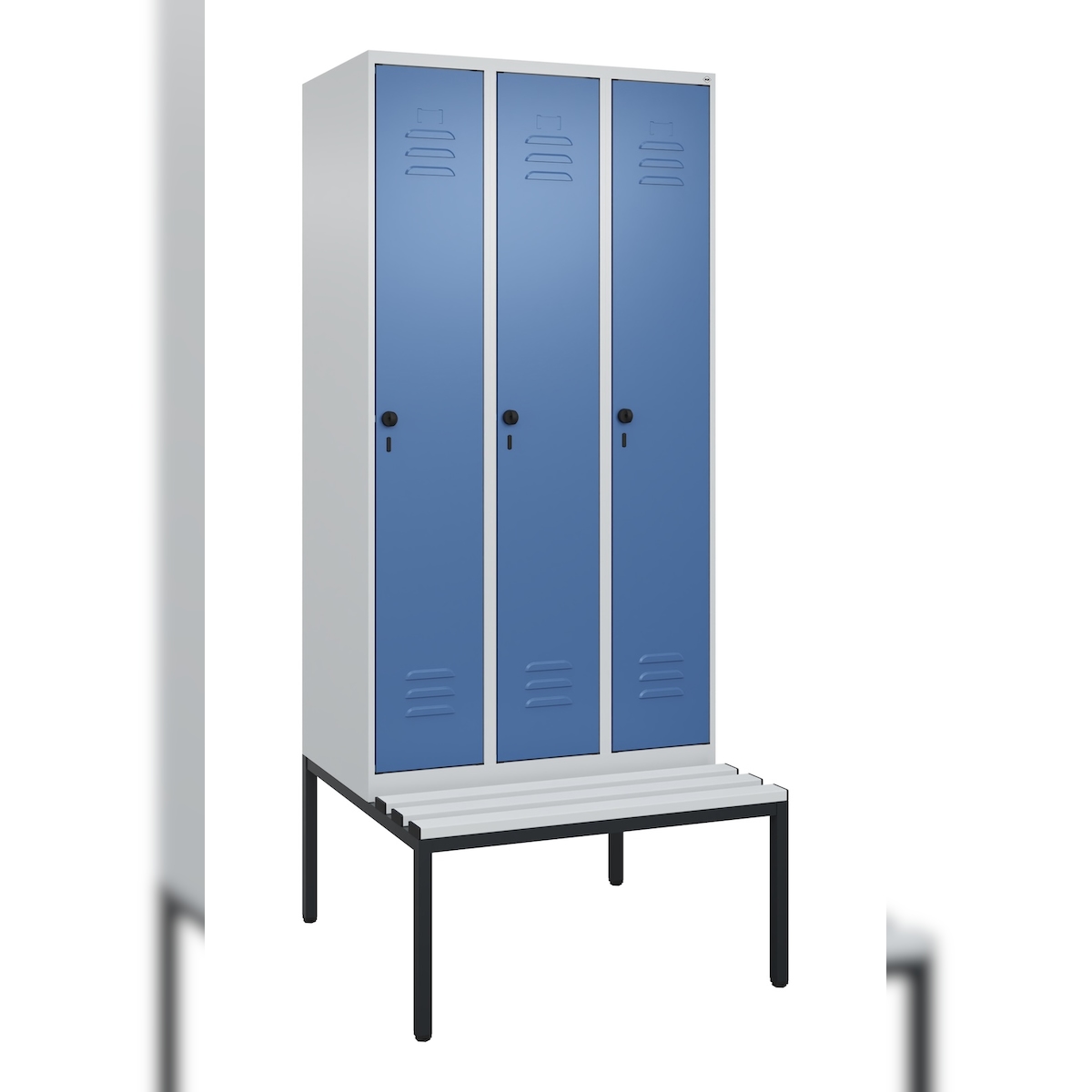 C+P Spind Classic PLUS, Kunststoff untergebaute Sitzbank, 3 Abteile, HxBxT 212x90x82cm, Sicherheitsdrehriegel, Hellgrau/Fernblau von PROREGAL