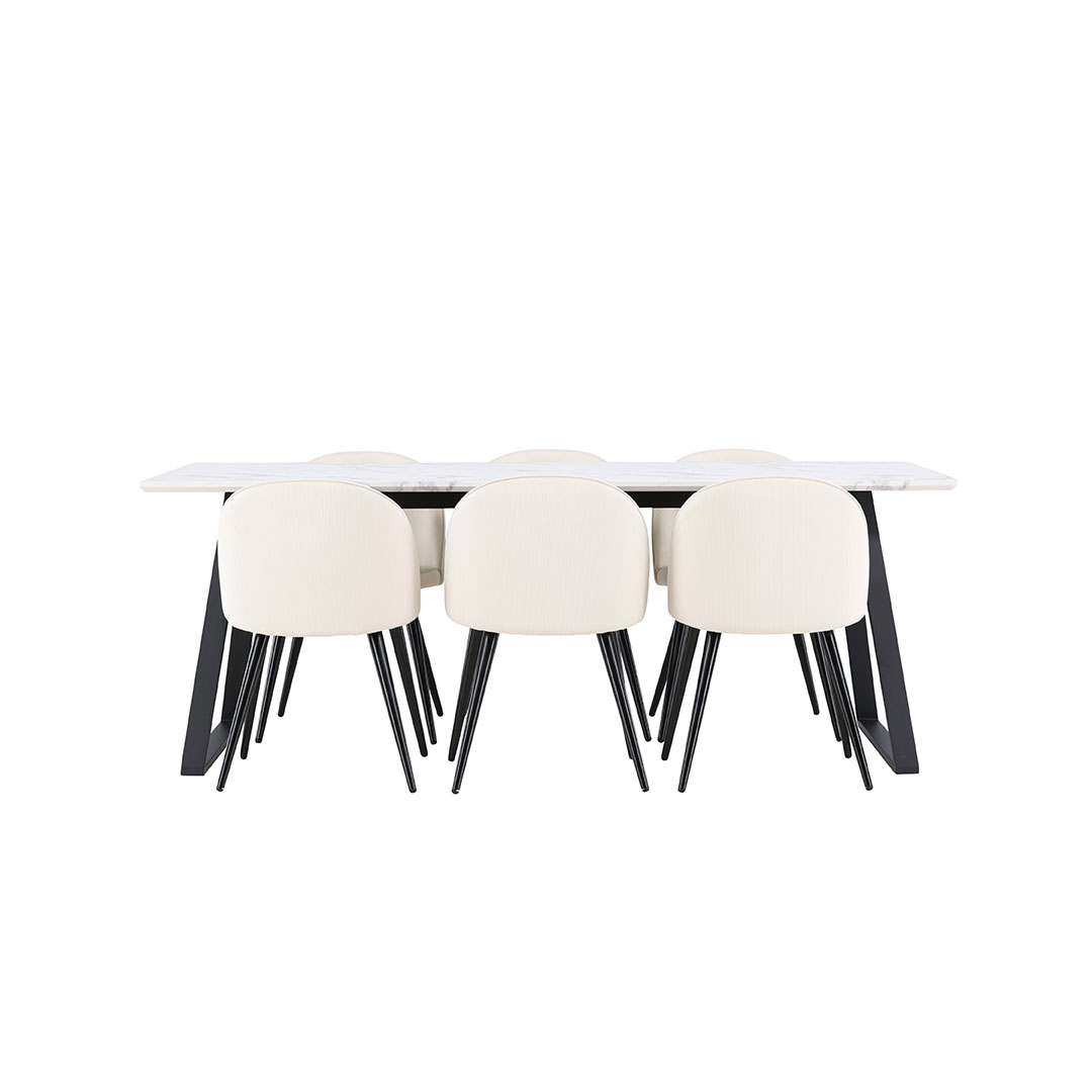 Malaga Essgruppe Esstisch 90x200cm weiß und 6 Skagen Stuhl samt beige.