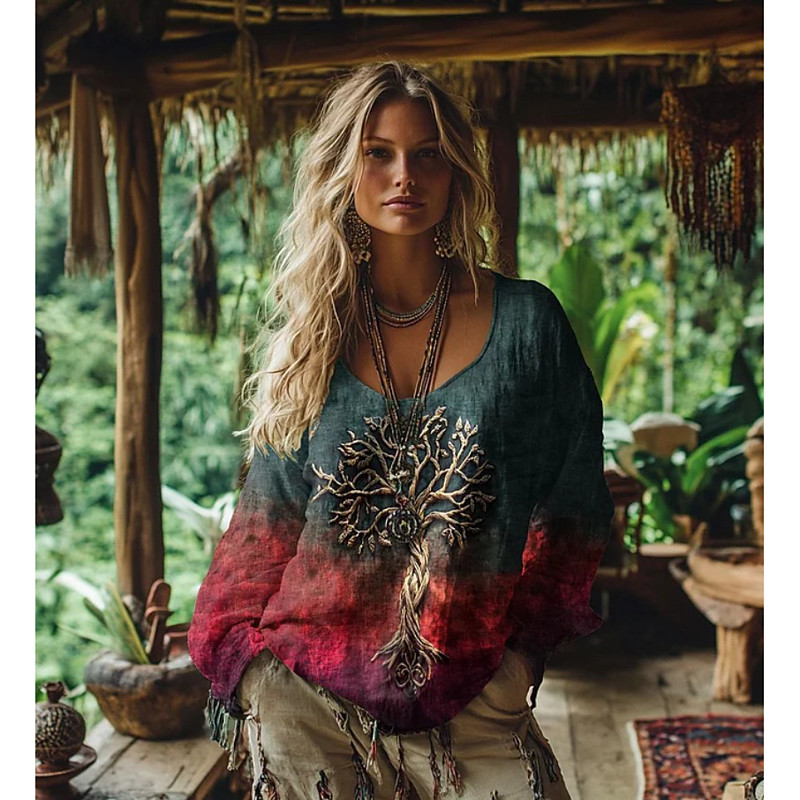Women's VIKING Boho T-shirt T Shirt Tee Top Floral Bohemia Vintage Ethnic Long Sleeve Crew Neck Regular Tops Daily Weekend Vacation Wear Print Blue Red Purple Fuchsia Green Summer Spring