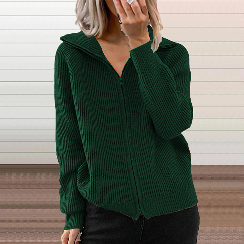 Women's Cardigan Fashion Solid Color Ribbed Shirt Collar Zipper Knitted Long Sleeve Regular Tops Knit Outdoor Daily Holiday Black Green Fall
