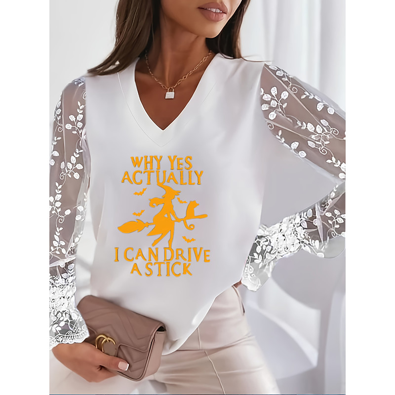 Halloween Women's T Shirt Lace Splicing Top Graphic Halloween Elegant Fashion Cute Long Sleeve Lantern Sleeve V Neck Regular Tops Going out Weekend Vacation Wear Lace Patchwork Black and White Pearl
