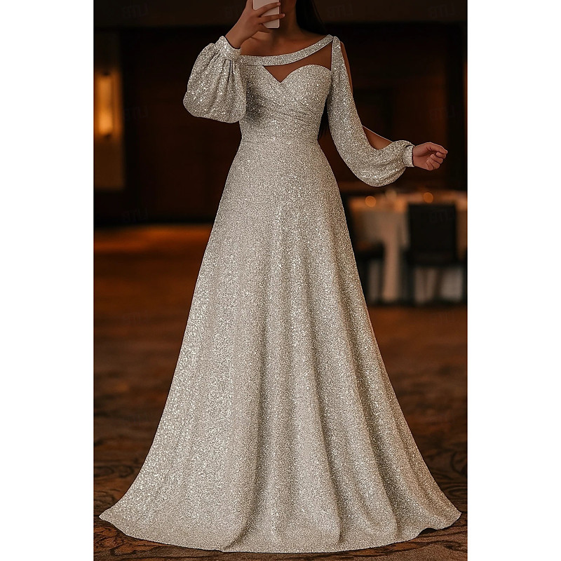A-Line Floor Length Evening Gown Ball Gown with Overskirt Elegant Glittering Long Sleeve High Neck Wedding Formal Pocket Satin Sequined with Glitter Pleats