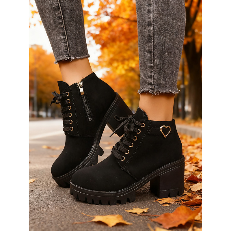Women's Beige Chunky Heel Ankle Boots – Lace-Up Combat Boots with Side Zipper for Fall, Streetwear Daily Outfits