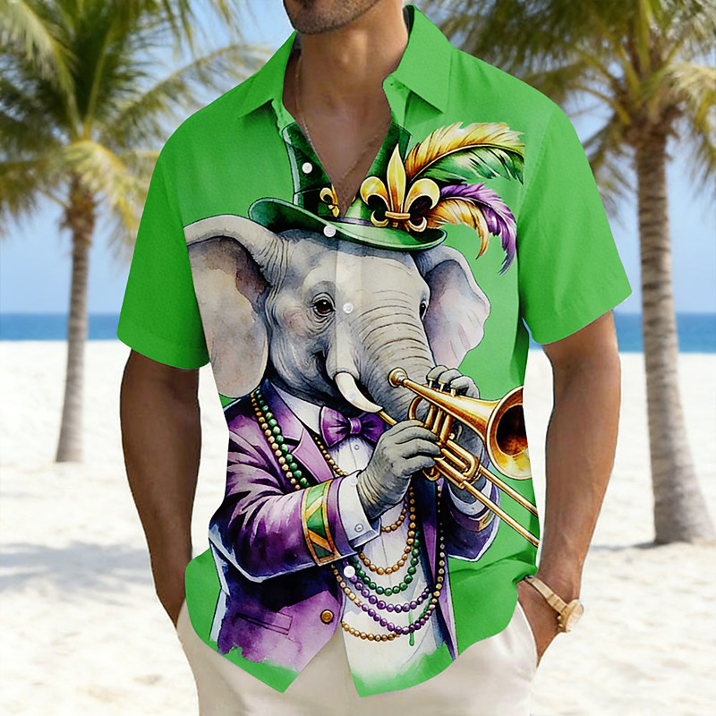 Mardi Gras Men's Elephant Carnival Mardi Gras Fleur De Lis Shirt Summer Shirt Button Up Shirt Short Sleeve Vintage Retro Holiday Summer Turndown 3D Print Linen Like Shirt Purple Green