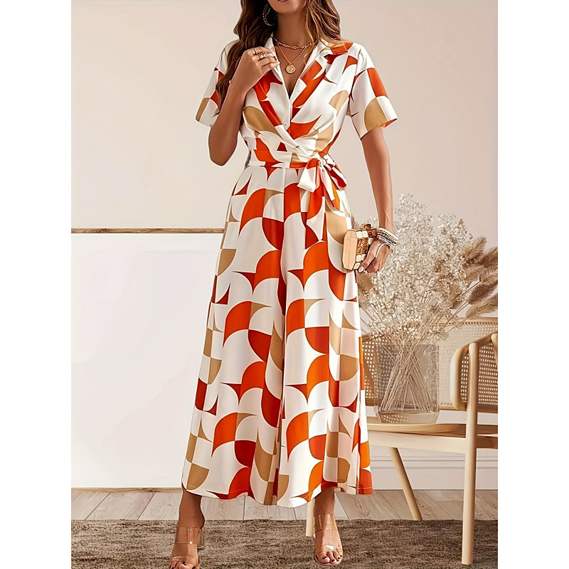 Women's Normal Jumpsuit Active Geometric Short Sleeve Wide Leg V Neck Lace up High Waist Vacation Daily Regular Fit Orange Green Summer