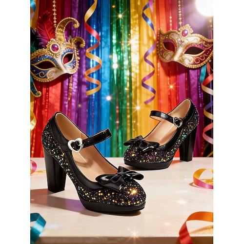 Damen Mardi Gras Gold Glitter Mary Jane Absätze mit Schleifenverzierung – Funkelnde Plateauschuhe Retro-Glam-Stil perfekt für Karneval und festliche Feiern