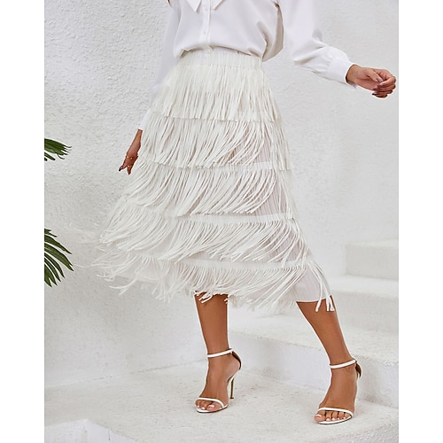 Per donna Gonna Elegante Vintage Moda Casual Midi Vita media Gonne Semplice Frangia con nappe Patchwork Micro-elastico Quotidiano Streetwear Verde mela Nero Bianco Verde chiaro Estate Poliestere