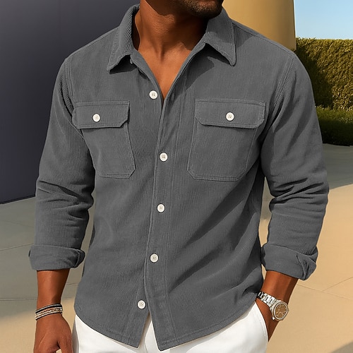 Per uomo Camicia di Velluto a Coste Nero Viola Marrone Grigio Manica Lunga Semplice Collo ripiegato Casuale All'aperto Tasca Abbigliamento Vintage Classico Casual