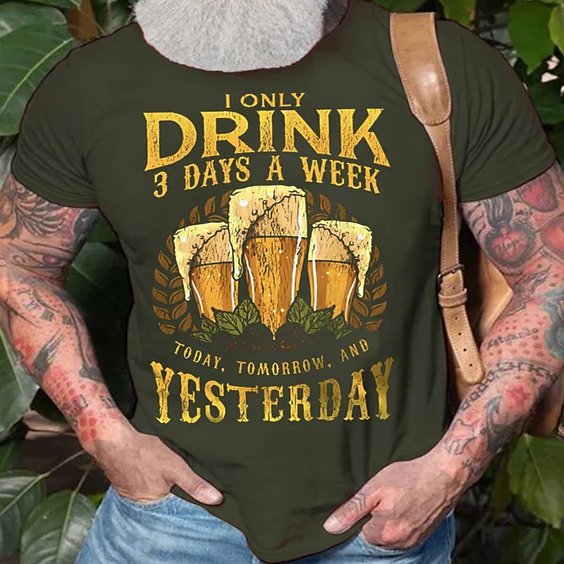 Men's Funny Drinking T-Shirt with Beer Pun Graphic: 'I Only Drink 3 Days A Week Today, Tomorrow, And Yesterday' Short Sleeve Tee