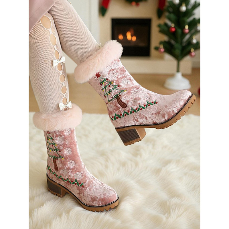 Women's Christmas Snow Boots - Red Velvet Snowflake Embroidered Boots with Fur Lining, High Heel for Holiday Parties, Winter Events and Festive Occasions