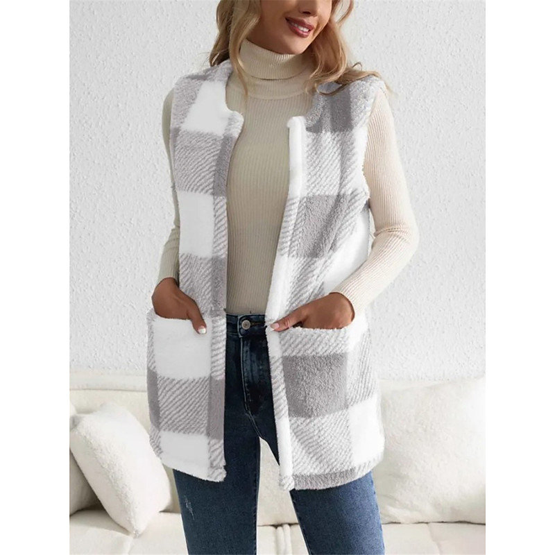 Women's Vest Outdoor Street Daily Wear Fall Winter Regular Coat Regular Fit Thermal Warm Breathable Stylish Casual Jacket Sleeveless Stripes and Plaid with Pockets Black Khaki Gray