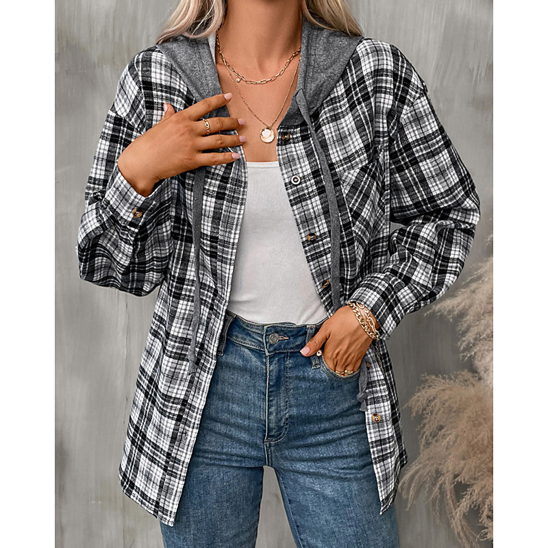 Women's Blouse Plaid Casual Long Sleeve Hooded Regular Tops Daily Going out Patchwork Buttons Blue Black Red Purple Green Fall Winter