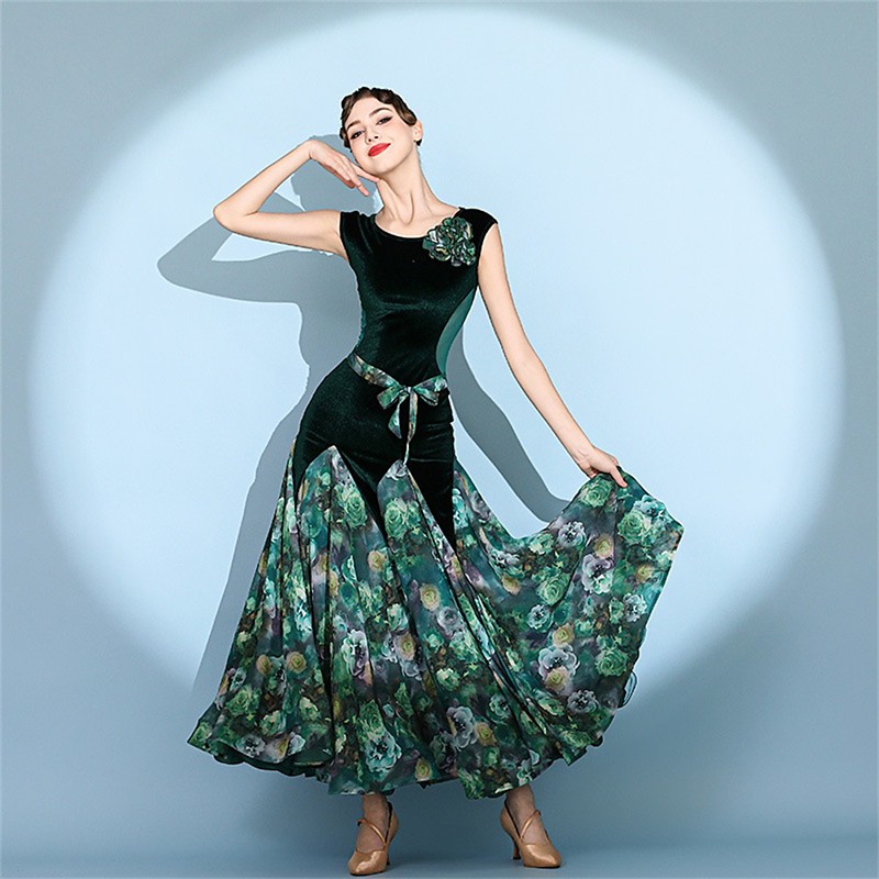 Women's Red Velvet Ballroom Dance Dress Sleeveless Floral Print Big Swing Skirt Waltz Tango Modern Standard Competition Gown