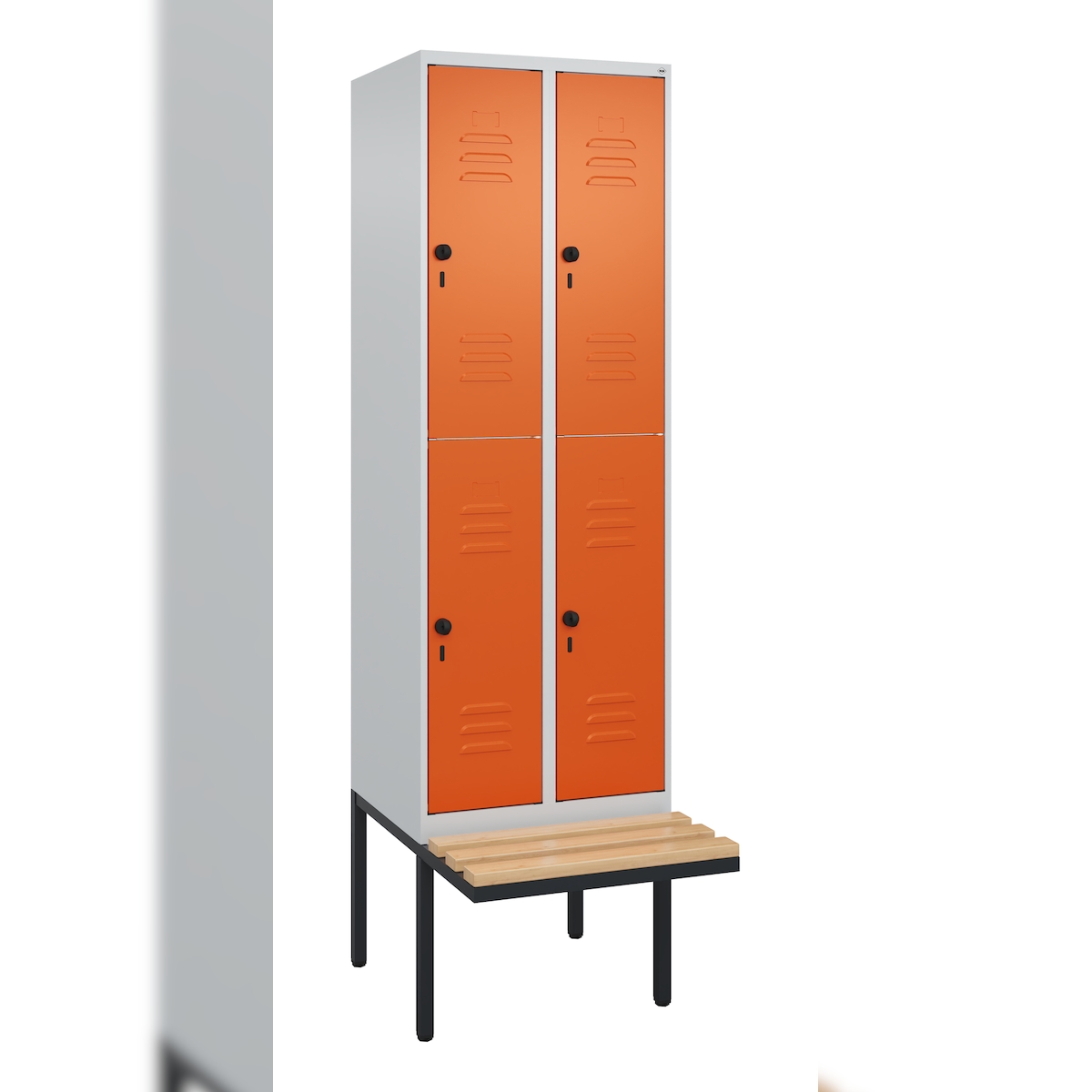 C+P Spind Classic PLUS, Buche schwebende Sitzbank, 4 Abteile, HxBxT 212x60x82cm, Sicherheitsdrehriegel, Hellgrau/Reinorange von PROREGAL