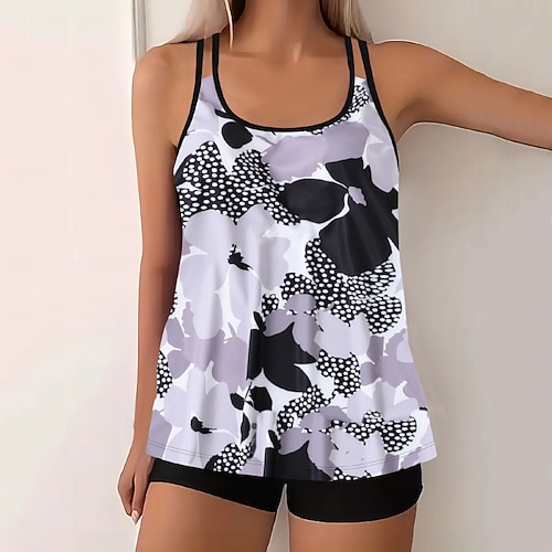 Costume da bagno tankini da donna a 2 pezzi pantaloni boy leg controllo della pancia alta vita schiena scoperta per vacanze in spiaggia floreale geometrico scollatura a piscina senza maniche