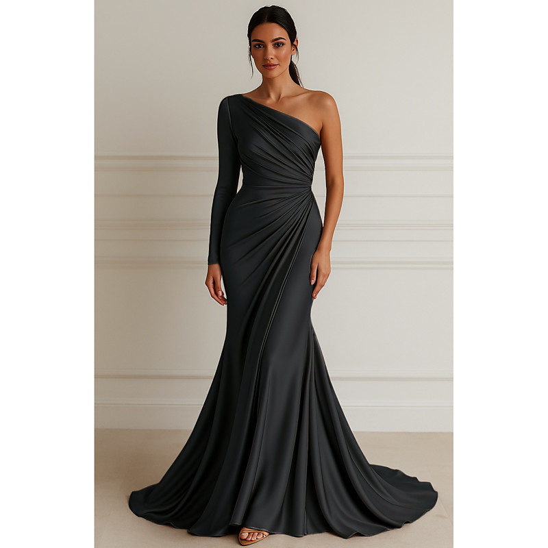 Mermaid Trumpet Floor Length Prom Dresses Evening Gown Ball Gown Formal Dress Elegant Glittering Celebrity Style Long Sleeve Off Shoulder Garden Party Wedding Stretch Satin with Pleats
