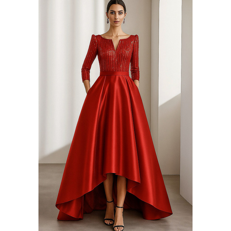 A-Line Floor Length Evening Gown Ball Gown Formal Dress Elegant Glittering High Low Long Sleeve V Neck Wedding Formal Satin Sequined with Glitter Pleats
