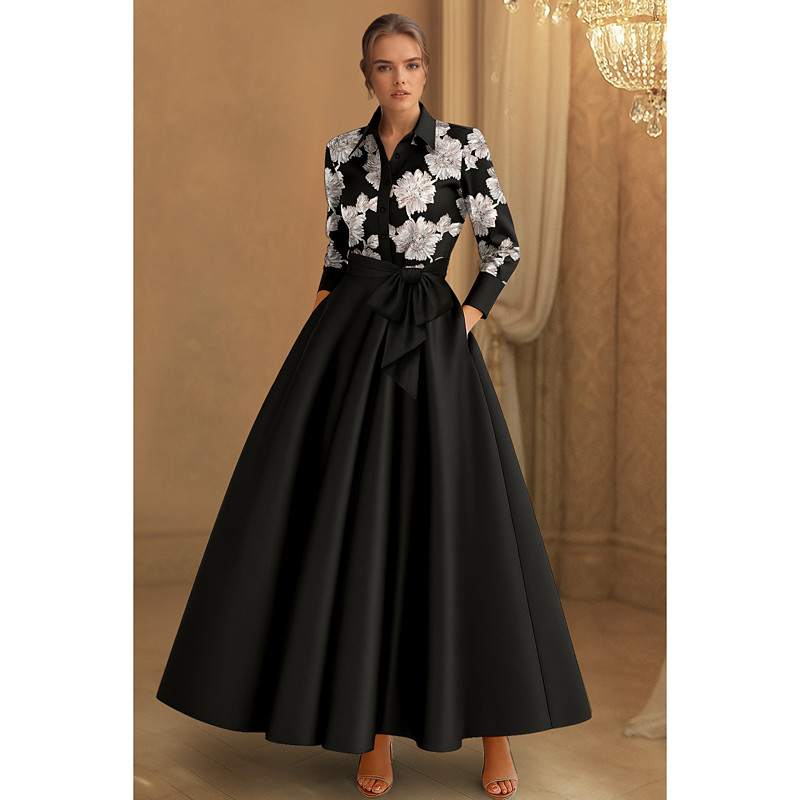 A-Line Floor Length Ankle Length Evening Gown Ball Gown Formal Dress Elegant Glittering Silky Long Sleeve Shirt Collar Wedding Formal Pocket Satin Stretch Satin with Bow(s) Appliques