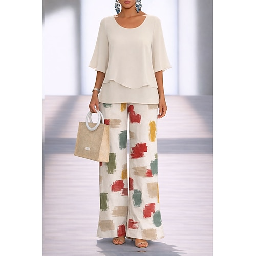 Per donna Set di Pantaloni Mezza Manica A farfalla Girocollo Grafico Geometrico Elegante Vacanza Casuale Quotidiano Viola Verde Beige Primavera Estate Vestibilità comoda