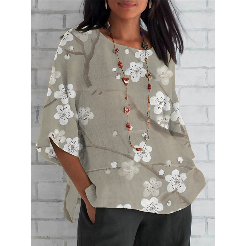 Women's Shirt Floral Daily Casual 3/4 Length Sleeve Crew Neck Regular Tops Daily Holiday Print Beige Gray Summer Spring Fall