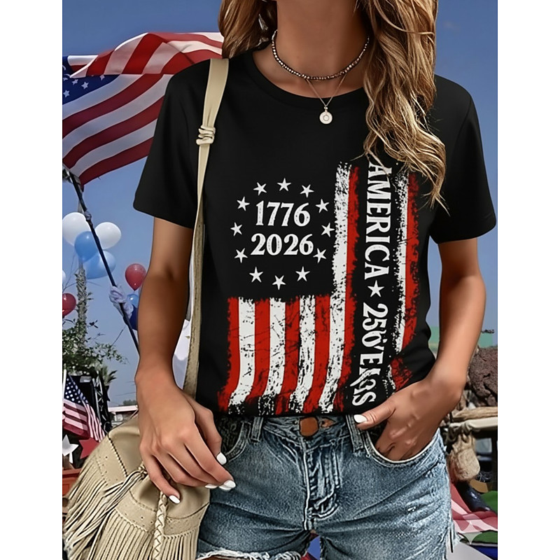 American 250th Women's T Shirt Graphic Independence Day Flag Vintage Stylish Classic Short Sleeve Crew Neck Regular Tops Daily Weekend Print Black Summer Spring Fall Winter